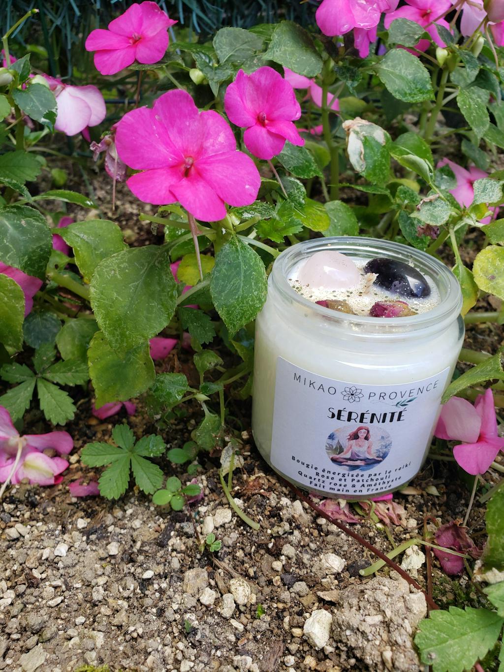 La bougie d'intention SÉRÉNITÉ est composée d’améthyste, de quartz rose et d’un mélange de fleurs soigneusement sélectionnées. Elle est parfumée au patchouli et à la rose. Cette bougie est énergisée par le reiki et contient des symboles sacrés.